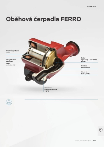 CENÍK 2021 Oběhová čerpadla FERRO Kvalitní bipolární motor Rotor Nejvyšší třída vyrobený z odolného odolnosti plastu vinutí proti přehřátí Odolné litinové tělo Maximální tlak 1,0 MPa Maximální pracovní teplota 110°C www.novaservis.cz 497