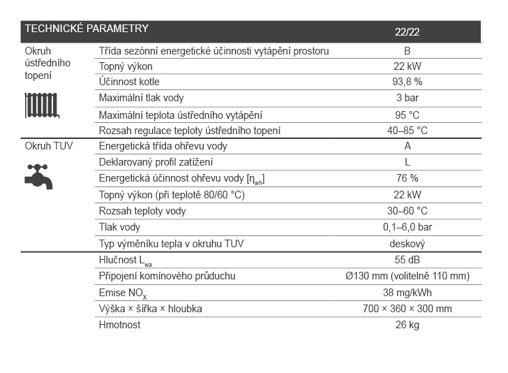do výbavy kotle patří dva výměníky tepla: hlavní měděný výměník tepla pro ústřední vytápění a přídavný deskový výměník tepla z nerezové oceli pro ohřev vody