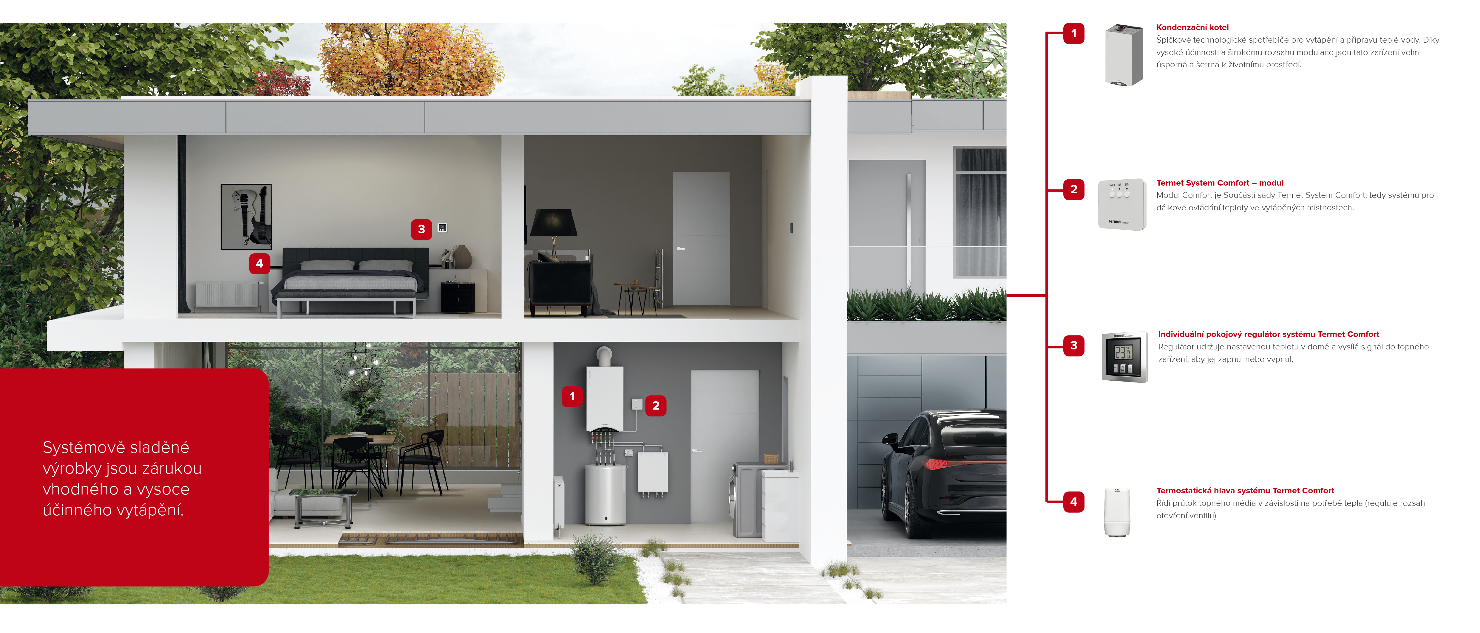Při vývoji zařízení Termet se neřeší pouze samotný zdroj tepla, ale komplexní řešení vytápění objektu. Vedle plynových kotlů a tepelných čerpadel zahrnuje Termet System Comfort také systémové příslušenství a inteligentní řídicí prvky, které podporují efektivní provoz a vysoký uživatelský komfort.