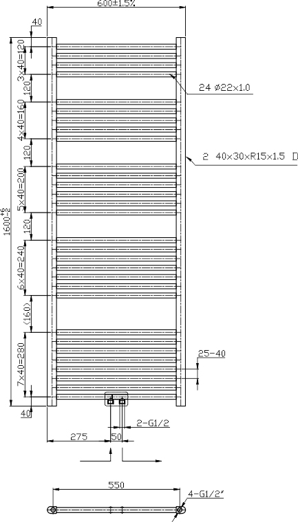 Rovné topidlo se středovým připojením. Rozměry 600 x 1600 mm. Součástí tělesa je zátka, zátka s odvzdušněním a 4ks montážních úchytů . Možnost připojení topné tyče.