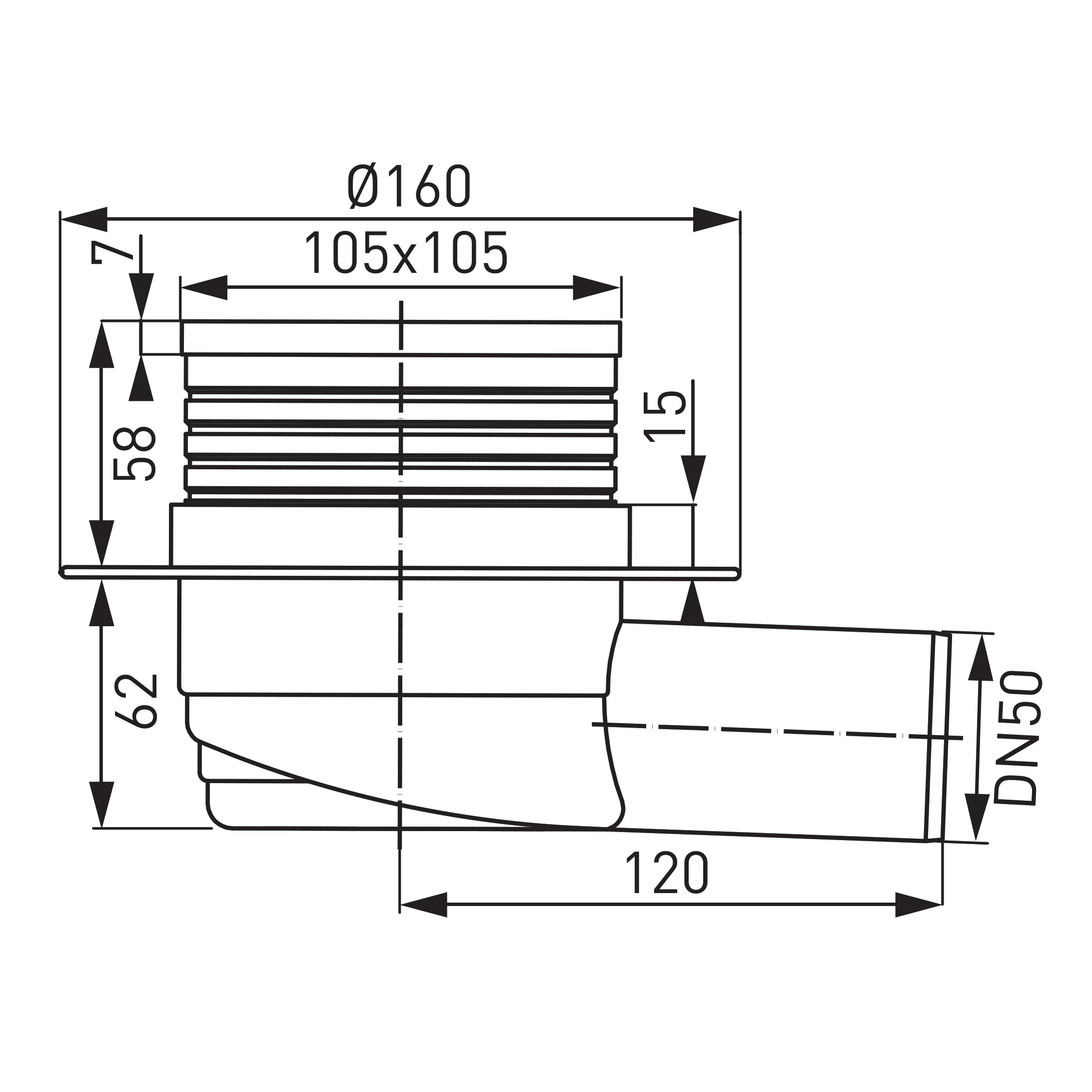 Rozměr 105 x 105 mm. Průměr odpadu 50 mm. Tělo sifonu je plastové.