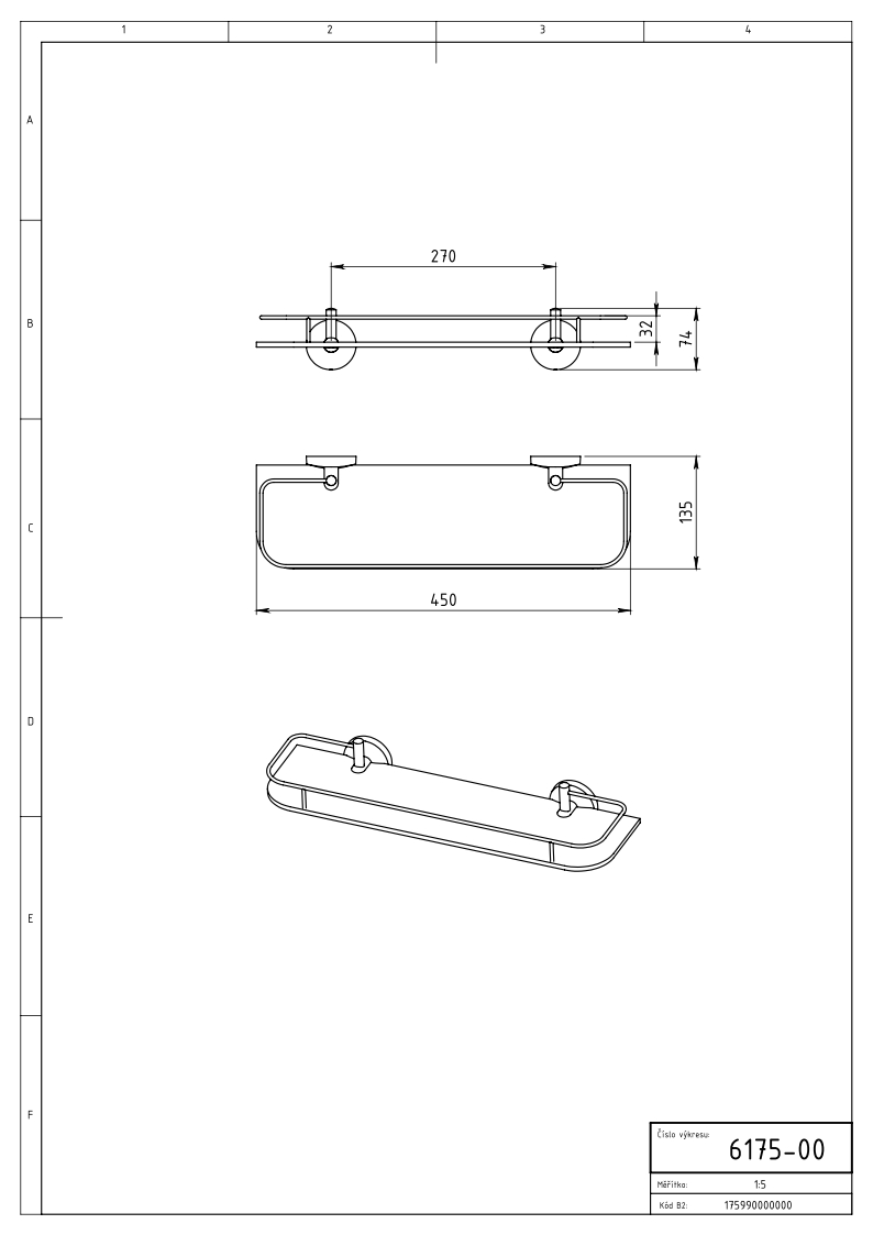 Rozměr skla poličky 125 x 450 mm. Sklo čiré, síla skla 6 mm, výška zábradlí 30 mm.