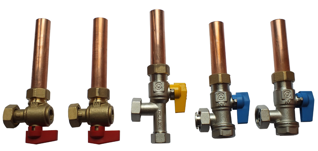 Komponenty: 1 plynový ventil ¾“ s filtrem, 2 vodní ventily ¾“ s filtrem, 2 vodní ventily ¾“ s filtrem, těsnění, matice měděných připojovacích trubek