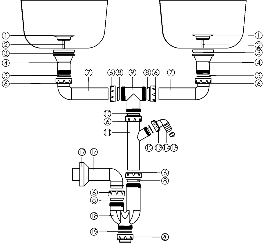 Sifon na dvojitý dřez, bez přepadu.