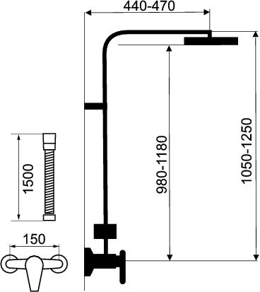 Kvalitní a odolná keramická kartuše 35 mm s prodlouženou zárukou 5 let. Prvotřídní chromové provedení. Set obsahuje nástěnnou sprchovou baterii s horním vývodem s roztečí 150 mm, hadici 150 cm, horní sprchu o rozměru 280x280 mm, 3 polohová ruční sprchu a posuvný jezdec s držákem ruční sprchy. Set je výškově nastavitelný od 1050 do 1250 mm. Umožňuje nastavit i vzdálenost vrchního úchytu od zdi v rozmezí od 50 do 80 mm.