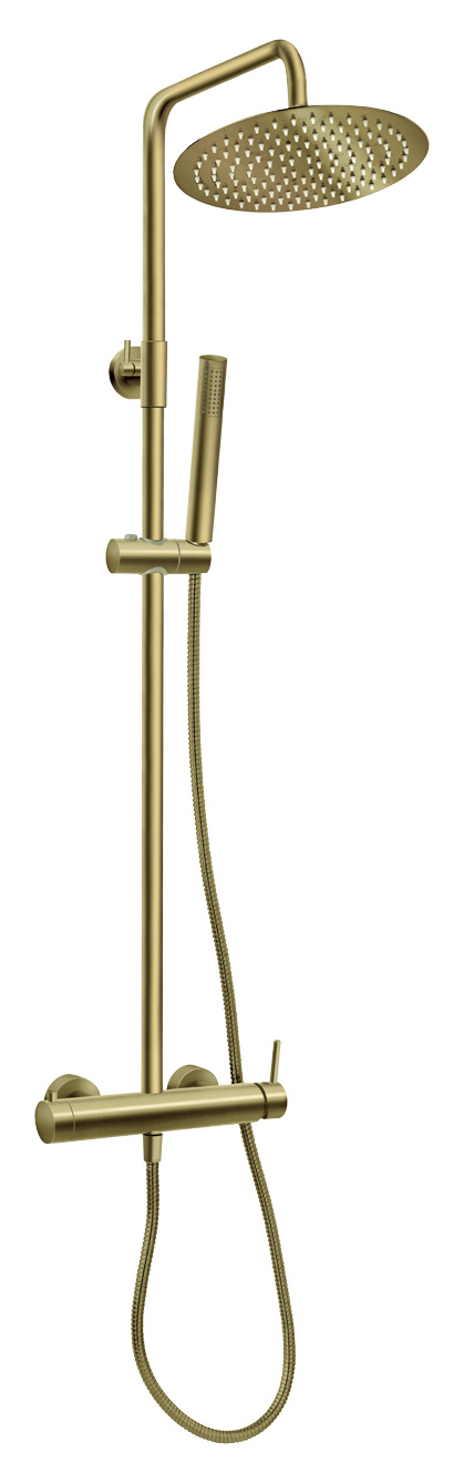 Sprchový set Ferro Ciriculus Brushed Gold s baterií s horním vývodem spojuje moderní design s vysokým komfortem. Jemně broušený Brushed Gold povrch dodává koupelně luxusní a nadčasový vzhled.