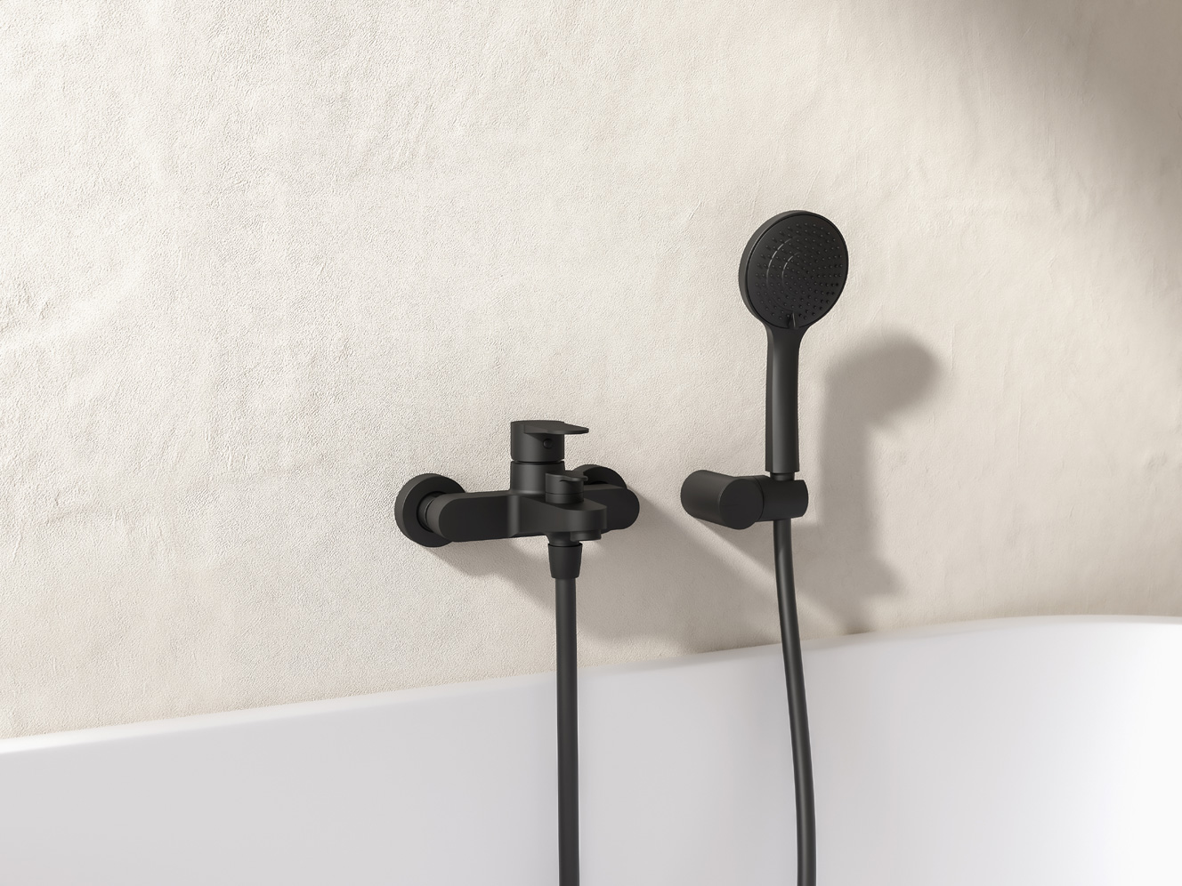 Vanová baterie Ferro Nostris Black v elegantní matné černé kombinuje moderní design s praktickým a komfortním používáním. Tato stylová povrchová úprava dodává koupelně sofistikovaný a výrazný vzhled, který dokonale ladí s aktuálními trendy moderního interiéru.